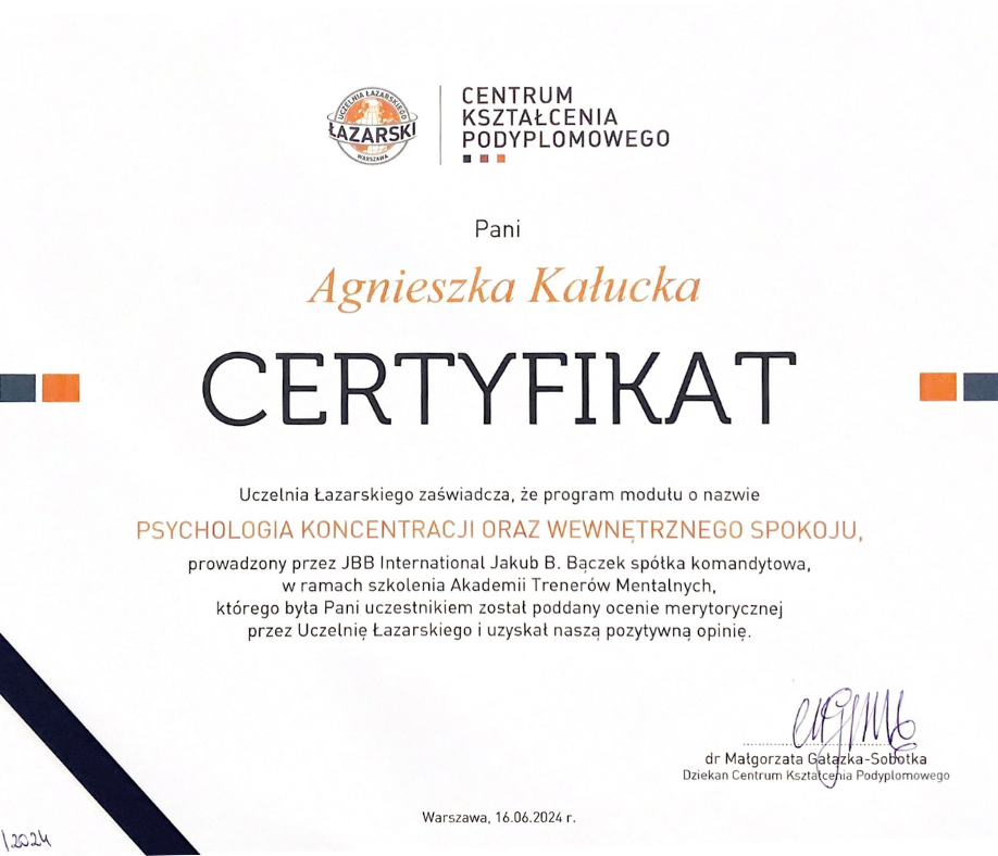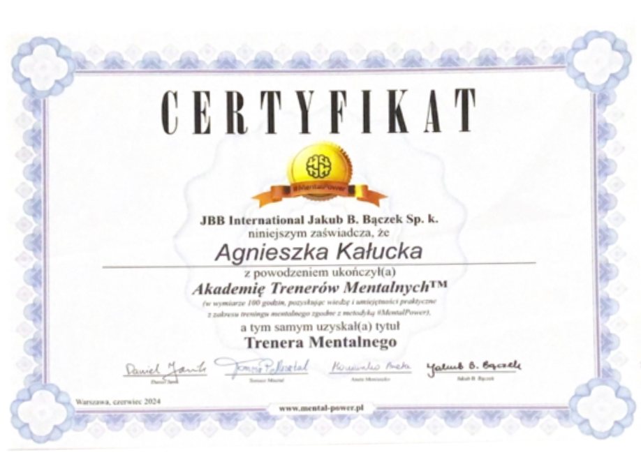 „Certyfikaty to dowód mojej pasji, zaangażowania i ciągłego dążenia do doskonałości. Każdy z nich to krok w stronę pełniejszego rozwoju, który pozwala mi jeszcze skuteczniej wspierać innych na ich drodze do sukcesu.”